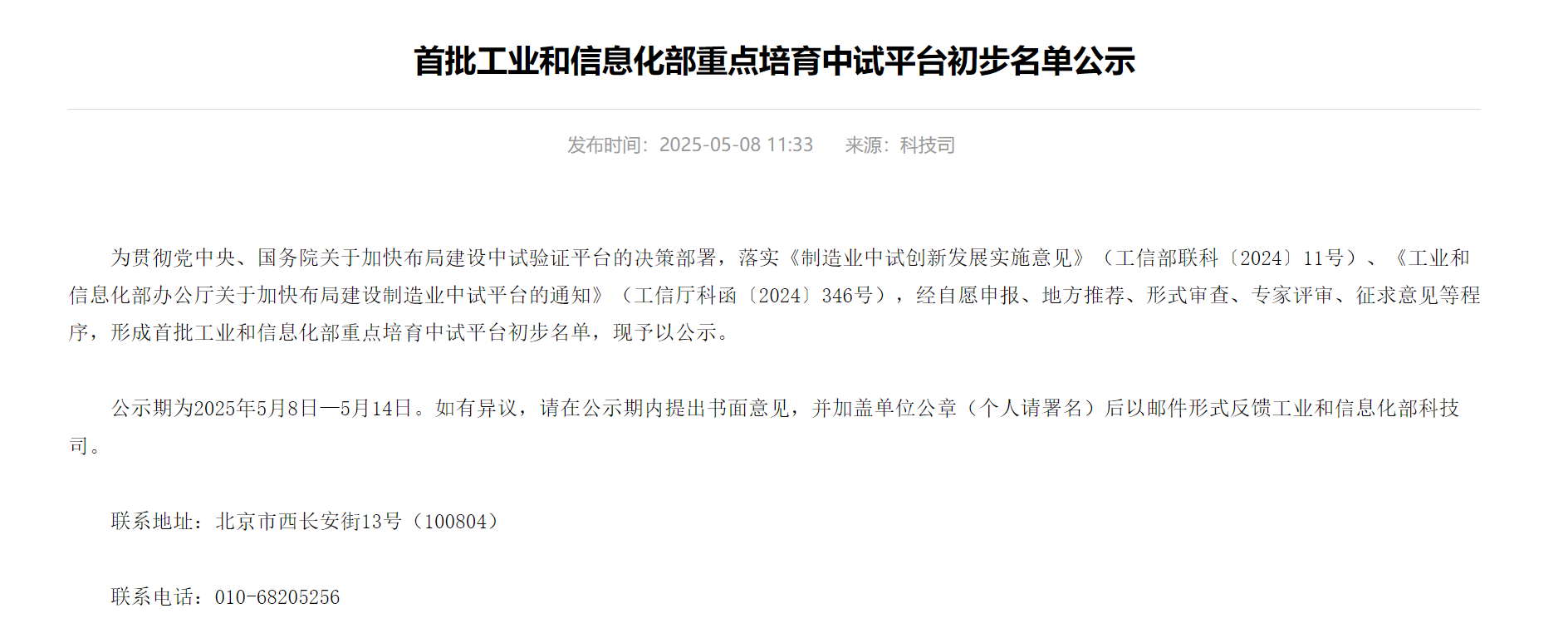 據(jù)悉,4月29日,工業(yè)和信息化部辦公廳發(fā)布《關(guān)于做好2025年工業(yè)和信息化質(zhì)量工作的通知》,其中提出,加快中試平臺(tái)梯次培育。加強(qiáng)制造業(yè)中試平臺(tái)儲(chǔ)備,優(yōu)化中試平臺(tái)布局重點(diǎn)方向及建設(shè)路徑,更新《制造業(yè)中試平臺(tái)建設(shè)指引》《制造業(yè)中試平臺(tái)重點(diǎn)方向建設(shè)要點(diǎn)》,指導(dǎo)地方聚焦重點(diǎn)領(lǐng)域,因地制宜、有序合理布局建設(shè)中試平臺(tái)。健全中試平臺(tái)梯次培育機(jī)制,遴選一批重點(diǎn)培育中試平臺(tái),推動(dòng)有條件的中試平臺(tái)向更高水平升級(jí)邁進(jìn)。