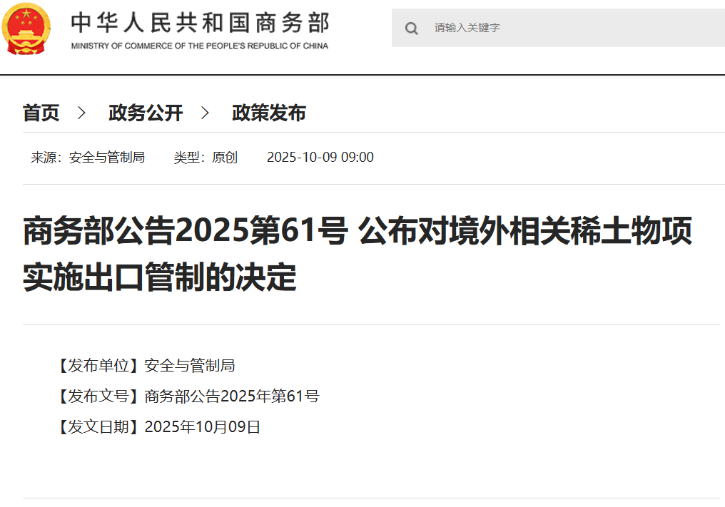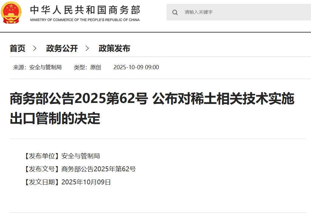 10月9日,商務部發(fā)布公告,公布對稀土相關(guān)技術(shù)實施出口管制的決定、公布對境外相關(guān)稀土物項實施出口管制的決定。