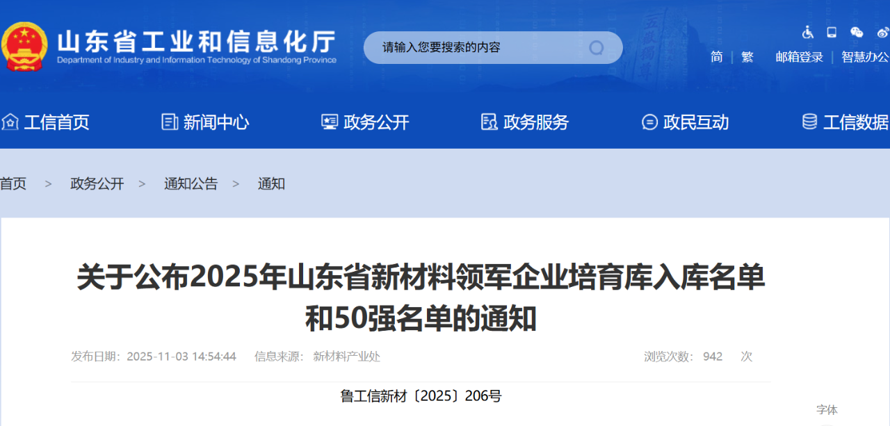 山東省工業(yè)和信息化廳于2025年11月3日正式公布2025年山東省新材料領軍企業(yè)培育庫入庫名單及新材料領軍企業(yè)50強名單,旨在健全優(yōu)質企業(yè)梯度培育體系,加快培育新質生產(chǎn)力,提升全省新材料產(chǎn)業(yè)核心競爭力。
