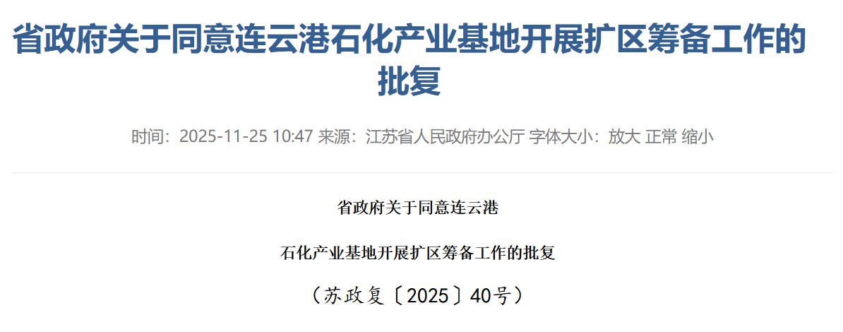 江蘇省政府于2025年11月17日批復(fù)同意連云港石化產(chǎn)業(yè)基地開展擴區(qū)籌備工作,基地總面積將增至62.14平方公里,新增的板橋片區(qū)8.64平方公里。批復(fù)明確要求堅持生態(tài)優(yōu)先、綠色發(fā)展、安全發(fā)展,高標準建設(shè)基礎(chǔ)設(shè)施,旨在將基地打造為全國化工園區(qū)高質(zhì)量建設(shè)管理的示范標桿。