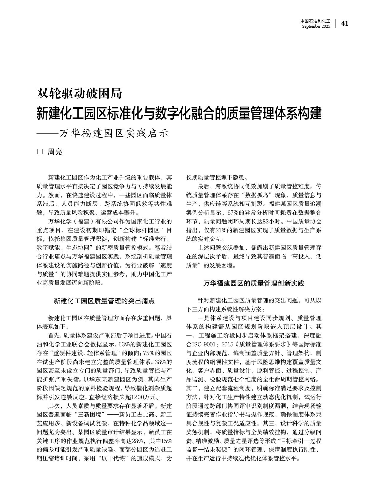 雙輪驅(qū)動破困局新建化工園區(qū)標準化與數(shù)字化融合的質(zhì)量管理體系構(gòu)建——萬華福建園區(qū)實踐啟示