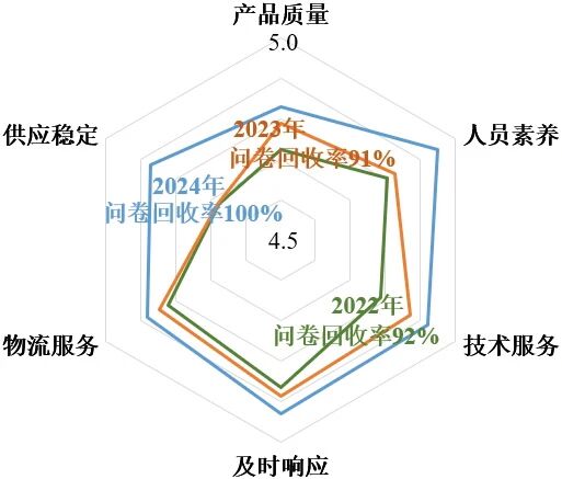 通過構(gòu)建全鏈條質(zhì)量管理體系,萬華福建園區(qū)在客戶滿意度方面實現(xiàn)顯著突破(如圖1)。產(chǎn)品質(zhì)量維度從4.72分提升至4.83分,人員素養(yǎng)、技術(shù)服務(wù)與及時響應(yīng)均突破4.90分高位。值得注意的是,2024年問卷回收率達100%,反映出客戶參與意愿的增強。多維指標的系統(tǒng)性提升印證了“質(zhì)量前移”策略的有效性。