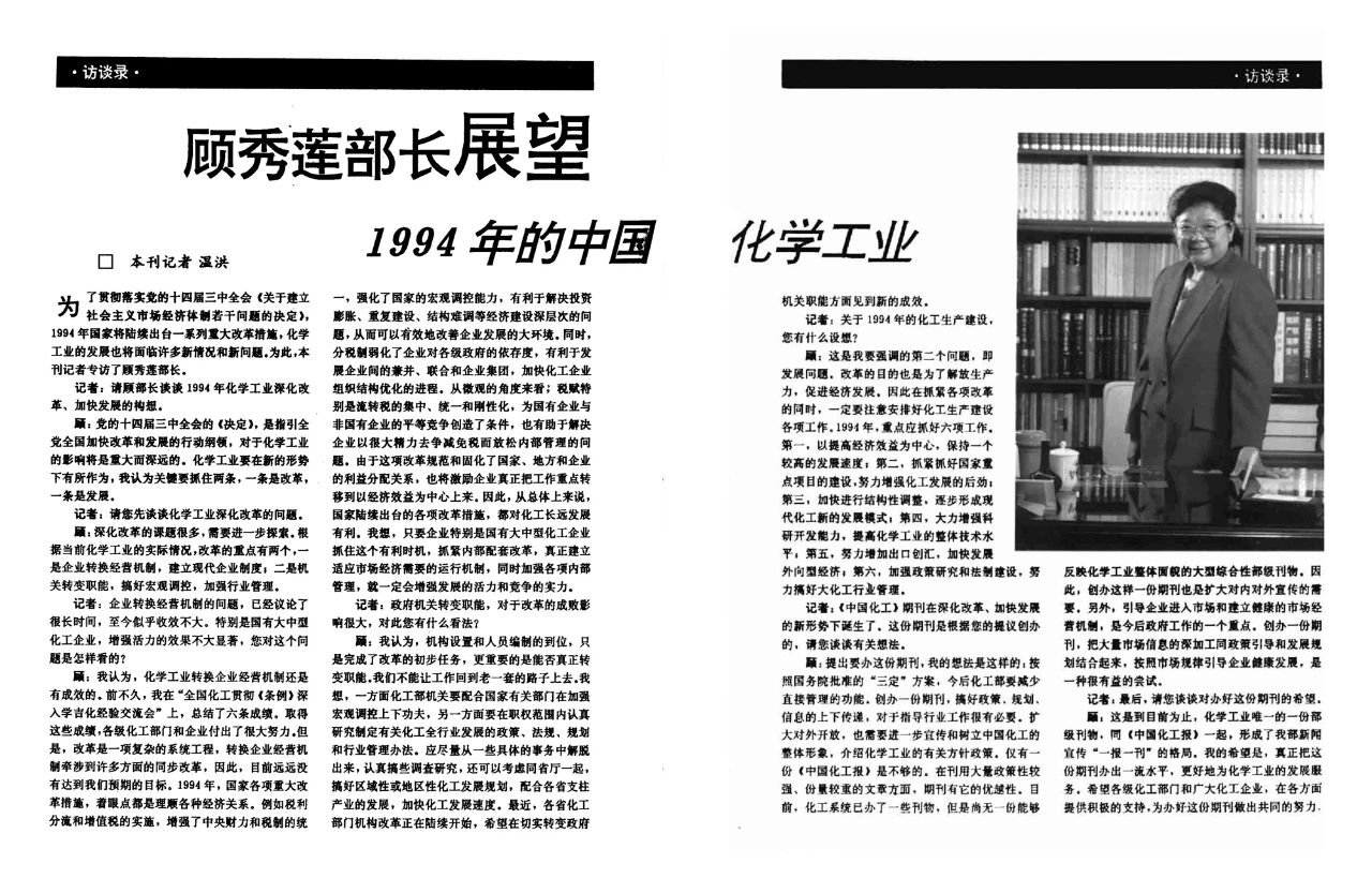 1994年,《中國石油和化工》雜志創(chuàng)刊。時任化工部部長顧秀蓮接受了本刊記者的采訪,展望當年中國化學工業(yè)。