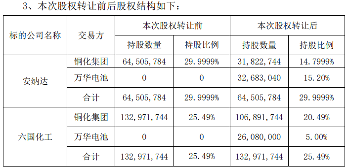 2月27日,萬華化學(xué)、六國化工、安納達(dá)三家公司同時(shí)發(fā)布公告,萬華化學(xué)不再受讓銅化集團(tuán)部分股份,而是通過萬華化學(xué)全資子公司,直接受讓安納達(dá)及六國化工的部分股權(quán),其中安納達(dá)仍將實(shí)現(xiàn)實(shí)控人變更,但收購六國化工的股權(quán)比例僅為5%,無法對(duì)六國化工形成控制。