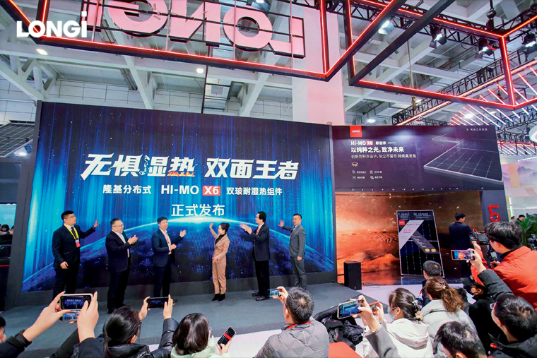圖為隆基首款基于HPBC技術(shù)的雙玻組件—Hi-MO X6雙玻耐濕熱光伏組件正式發(fā)布