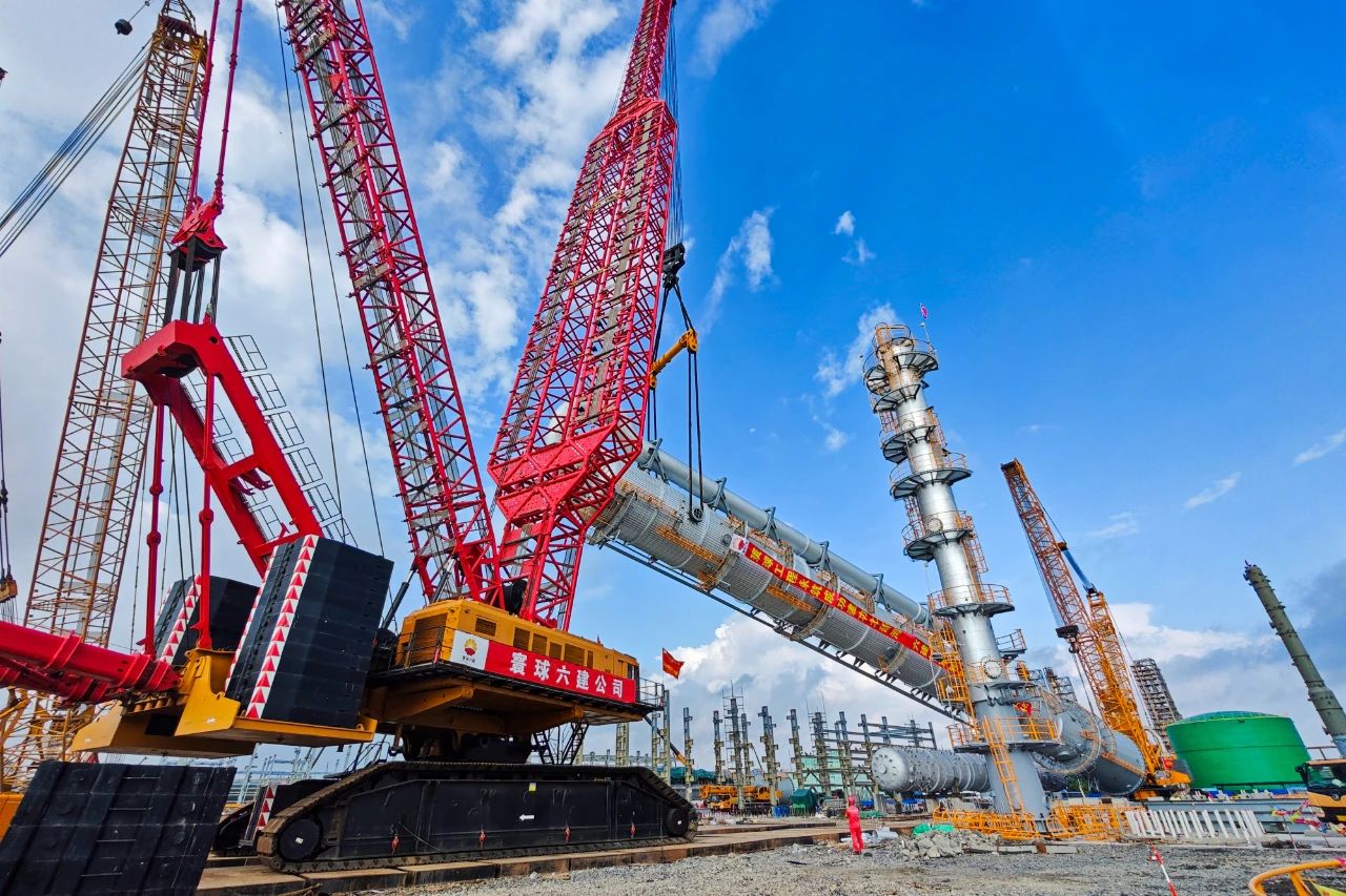 廣西石化百萬噸乙烯項目超大型塔器一次吊裝成功