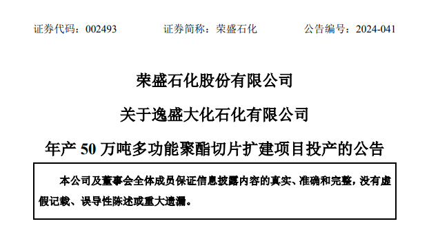 4月2日晚間,榮盛石化發(fā)布公告稱(chēng),其控股子公司逸盛大化石化有限公司年產(chǎn)100萬(wàn)噸多功能聚酯切片項(xiàng)目于近日順利投產(chǎn),截至目前該項(xiàng)目四條生產(chǎn)線(xiàn)已全部投產(chǎn),產(chǎn)能共計(jì)100萬(wàn)噸/年。