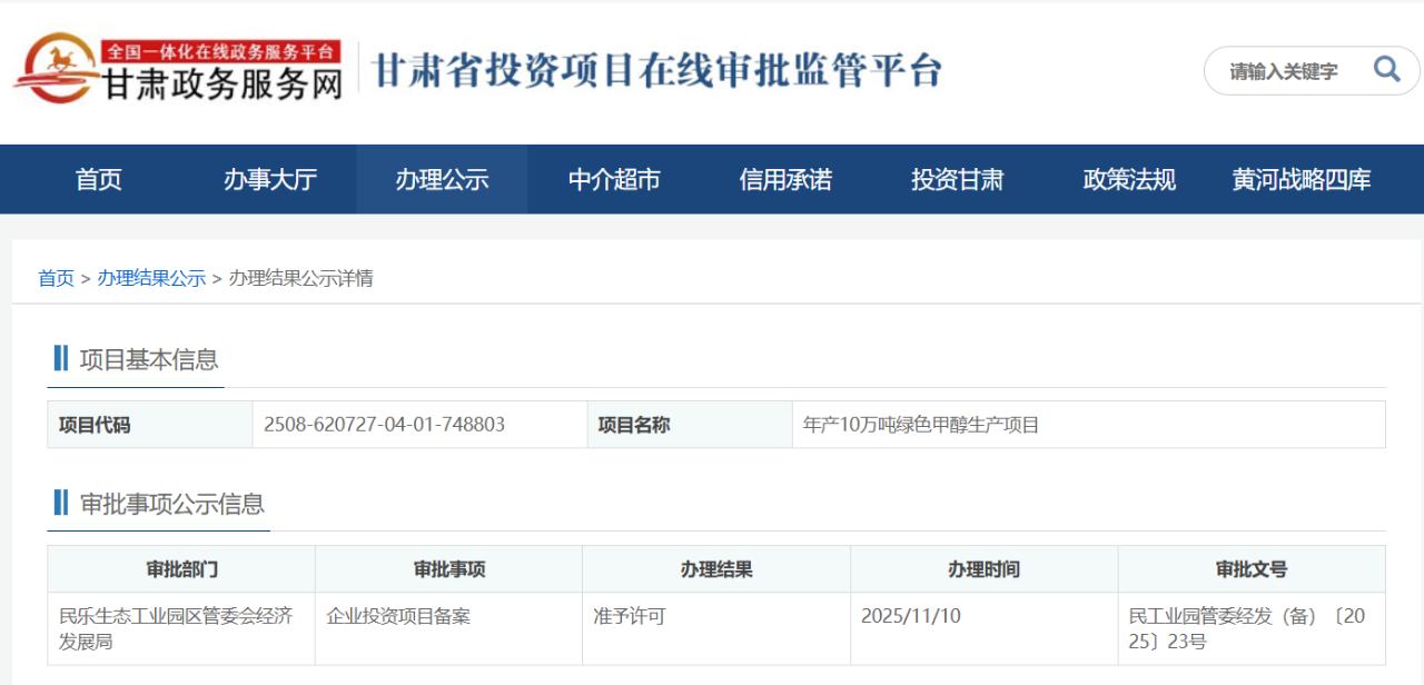 甘肅省年產(chǎn)10萬噸綠色甲醇生產(chǎn)項(xiàng)目備案準(zhǔn)予許可