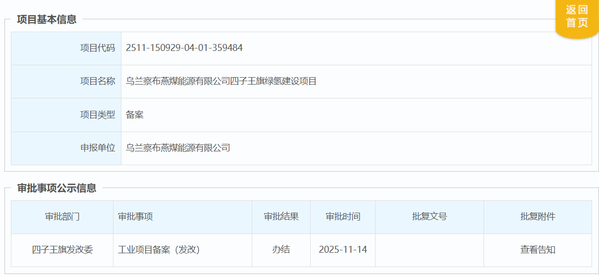 11月14日,內(nèi)蒙古自治區(qū)投資項(xiàng)目在線審批辦事大廳相關(guān)信息顯示:烏蘭察布燕煤能源有限公司提交的烏蘭察布燕煤能源有限公司四子王旗綠氫建設(shè)項(xiàng)目,符合產(chǎn)業(yè)政策和市場(chǎng)準(zhǔn)入標(biāo)準(zhǔn),正式準(zhǔn)予備案。